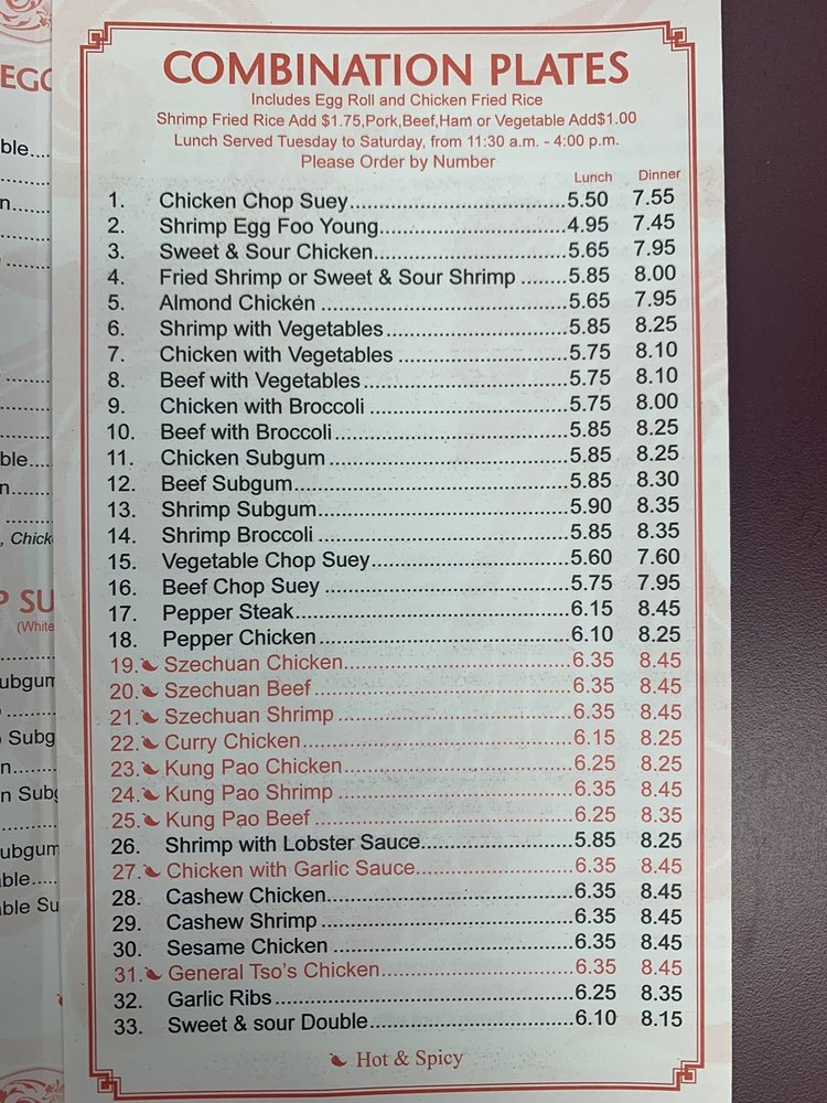 Beef subgum typically includes a mix of vegetables and beef, stir-fried and served with chicken fried rice and an eggroll.